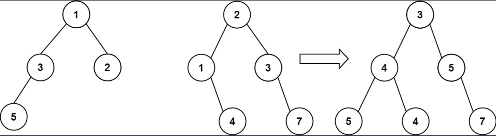 想象一下,当你将其中一棵覆盖到另一棵之上时,两棵树上的一些节点将会重叠(而另一些不会)。你需要将这两棵树合并成一棵新二叉树。合并的规则是:如果两个节点重叠,那么将这两个节点的值相加作为合并后节点的新值;否则,不为null
